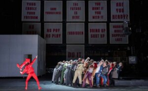 “Mahagonny first reached the stage in Berlin in 1930, and you might say that the feeling in the world now is not so very different, but Manton doesn’t give us obvious parallels or references to Trump and Vance. The joke is more on us. Those sucker tourists, initially in office wear, making their first appearance like extra audience members, lined up in the aisles and stood in the boxes.”